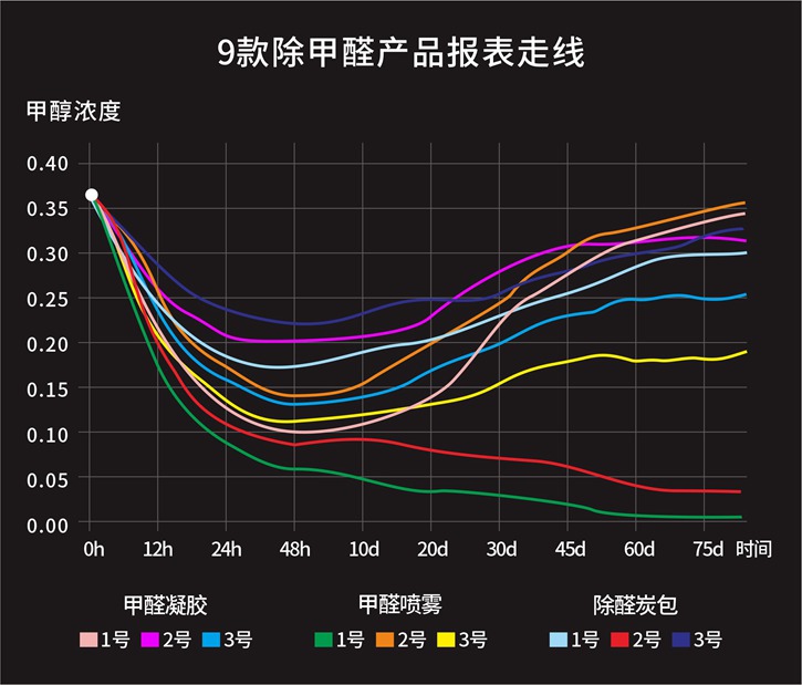 本期9款除甲醛产品均有除甲醛效果,但是深度除甲醛方面,则差异巨大,从客观实测来看,甲醛喷雾效果还是比较直接的,喷雾①号、具有深度除甲醛效果,没有反弹。其次是炭包类型,检测中炭具②号表现良好,虽然没喷雾快速,但是也是可以达到深度除甲醛效果,长期数据监测中也没有反弹。经检测,甲醛凝胶果冻类型的除醛效果,与使用安全性都不够理想。